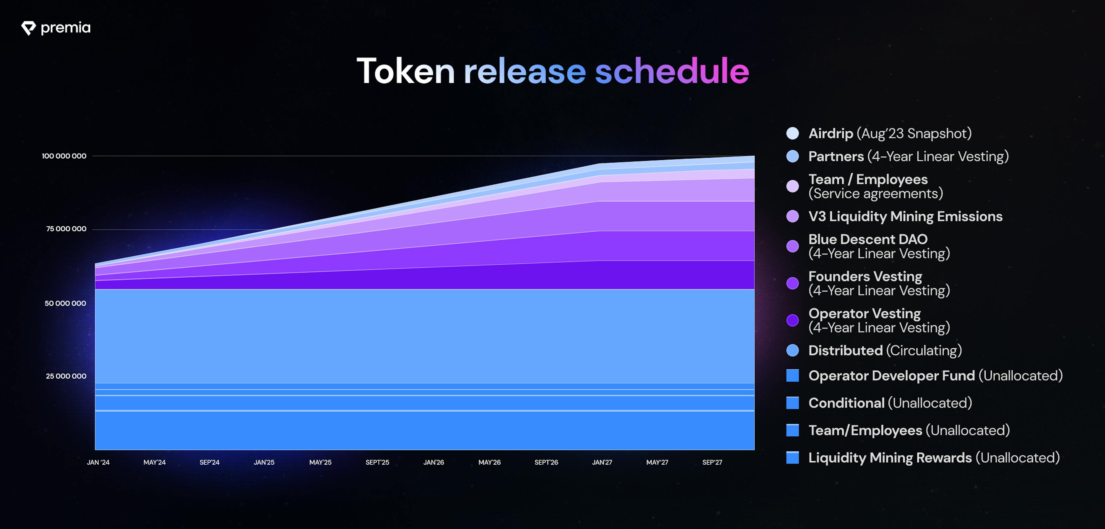 As of February 2024, Premia has no big boys backing it - no VCs, no nothing. Alongside rewarding active ecosystem participants, the PREMIA token is meant to ensure the long-term vitality, sustainability, maintenance, and continued development of the protocol.